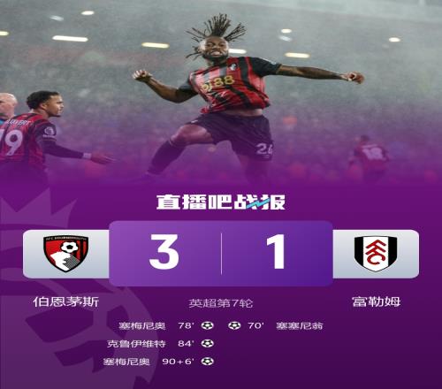 體育播報10月4日宣 英超第7輪先賽一場,伯恩茅斯主場3-1擊敗富勒姆。